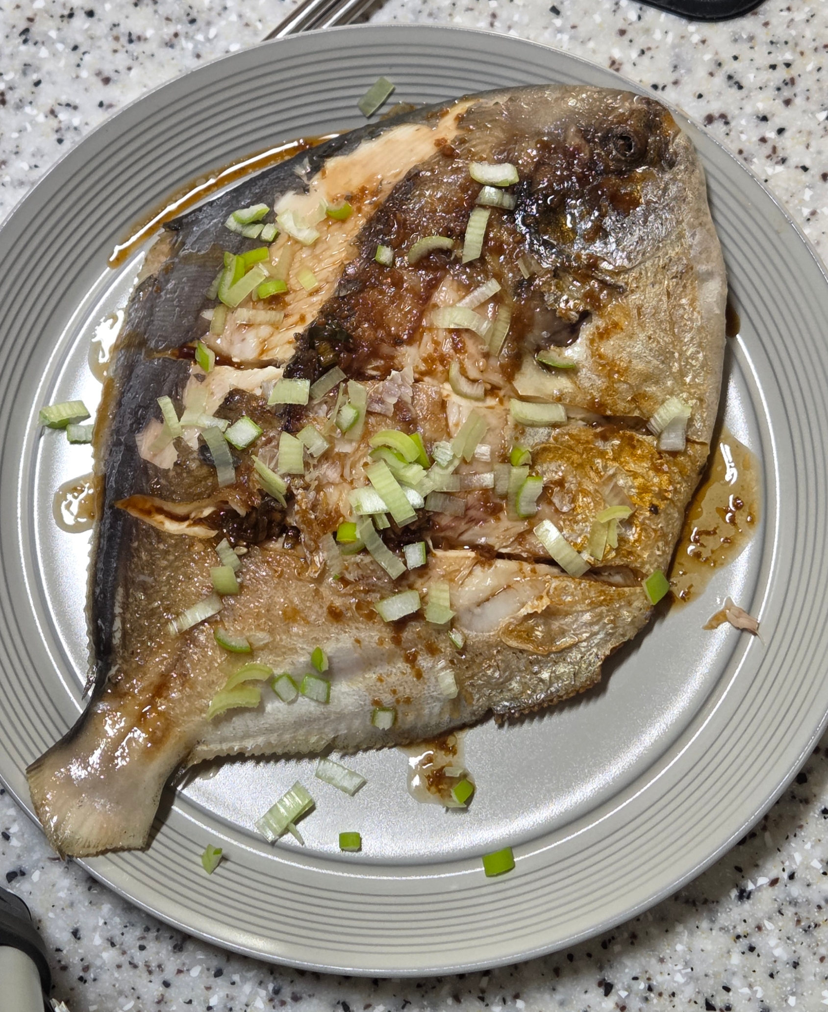 식용유를 넉넉하게 두르고, 병어를 넣었습니다. 워낙 살집이 많은 녀석이라 후라이팬에 닿지 않는 면적이 많네요.